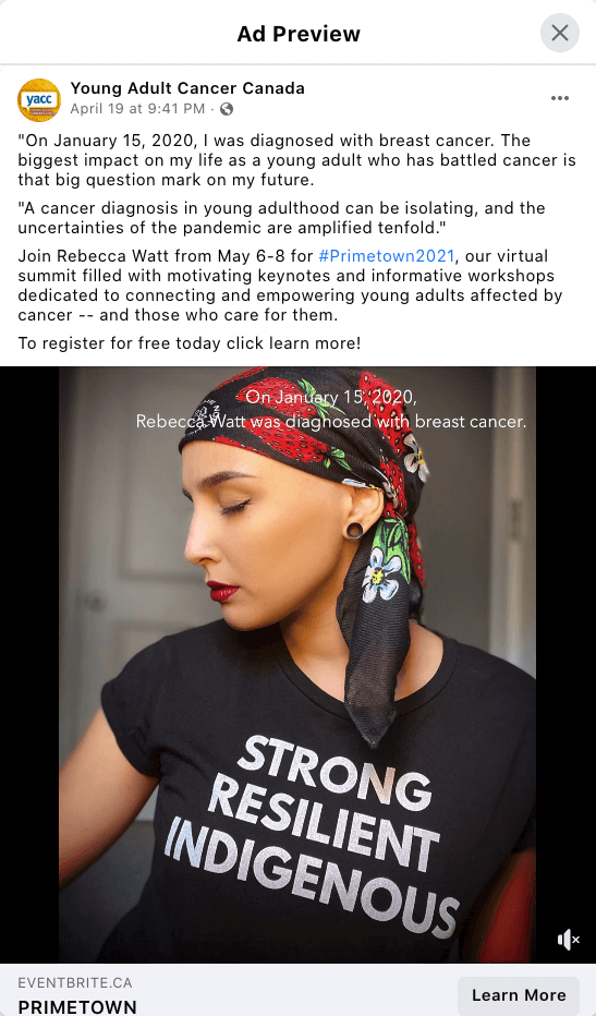We also recently developed a creator campaign for the Young Adult Cancer Canada (YACC) virtual summit, Primetown. For YACC, it was vital to partner with content creators that represent different races and socioeconomic backgrounds – and to give space for the creators’ voices and experiences with cancer to shine through. By adding diversity in this creator campaign, BlueSky was able to tap into every corner of YACC’s audience demographic through organic posts and targeted paid ads on Instagram and Facebook.